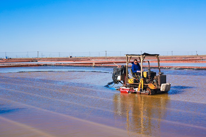 青鋒公司鹽區(qū)四副灘同時開耙,扒鹽、活茬全部采用機械作業(yè)。目前,鹵水充足,每天可完成2個結晶池收鹽。