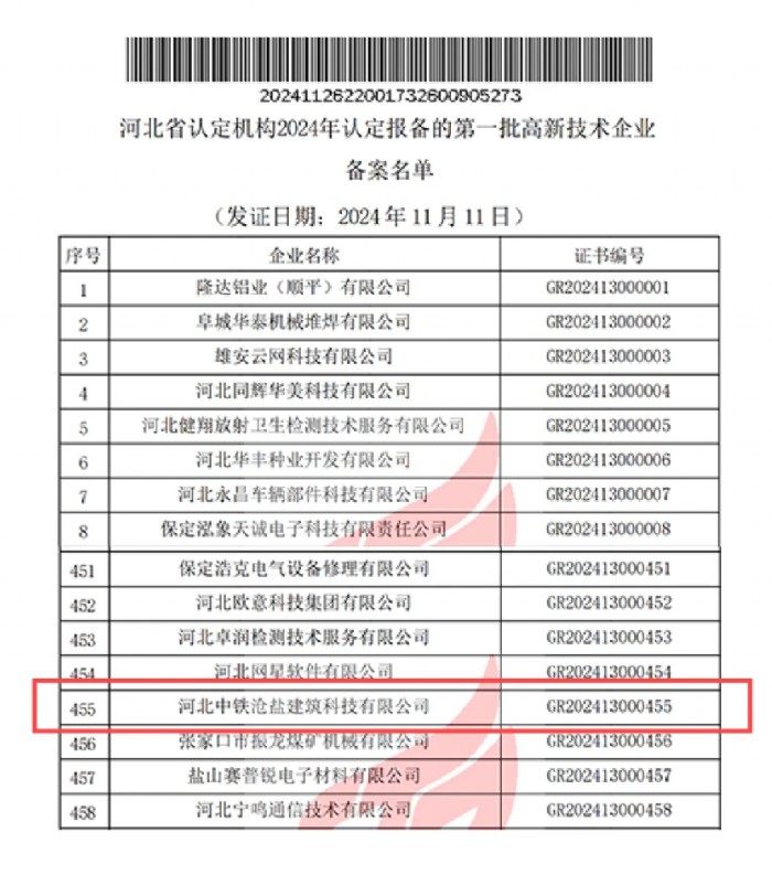 近日,河北中鐵滄鹽建筑科技有限公司順利通過了國(guó)家高新技術(shù)企業(yè)復(fù)審,并于2024年11月27日取得了新版“國(guó)家高新技術(shù)企業(yè)”證書。